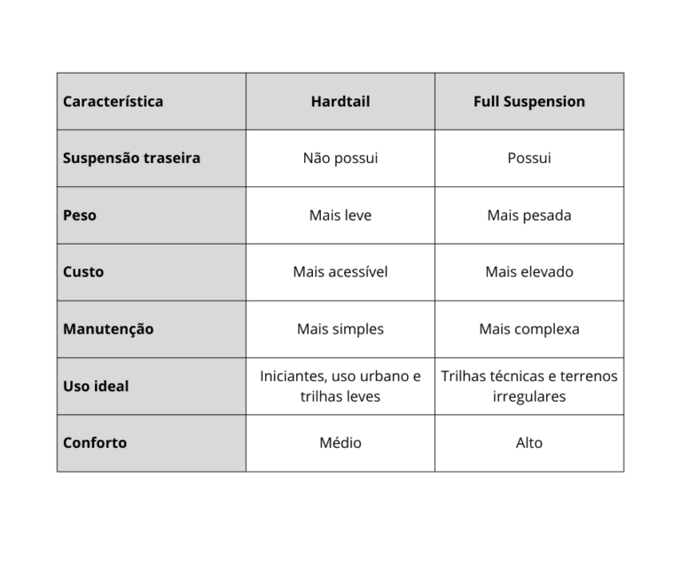 Bicicletas com suspensão total oferecem mais conforto e controle em terrenos irregulares, enquanto modelos hardtail (sem suspensão traseira) são mais leves e eficientes para subidas e uso recreativo.